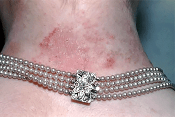 If you only occasionally touch what’s causing contact dermatitis, the rash can come and go. Because an allergic reaction can take time to appear, it can take a bit of detective work to figure out what’s causing the rash. By seeing a dermatologist, this woman discovered that she has a nickel allergy. The necklace shown in this picture contains nickel, which is causing her rash.